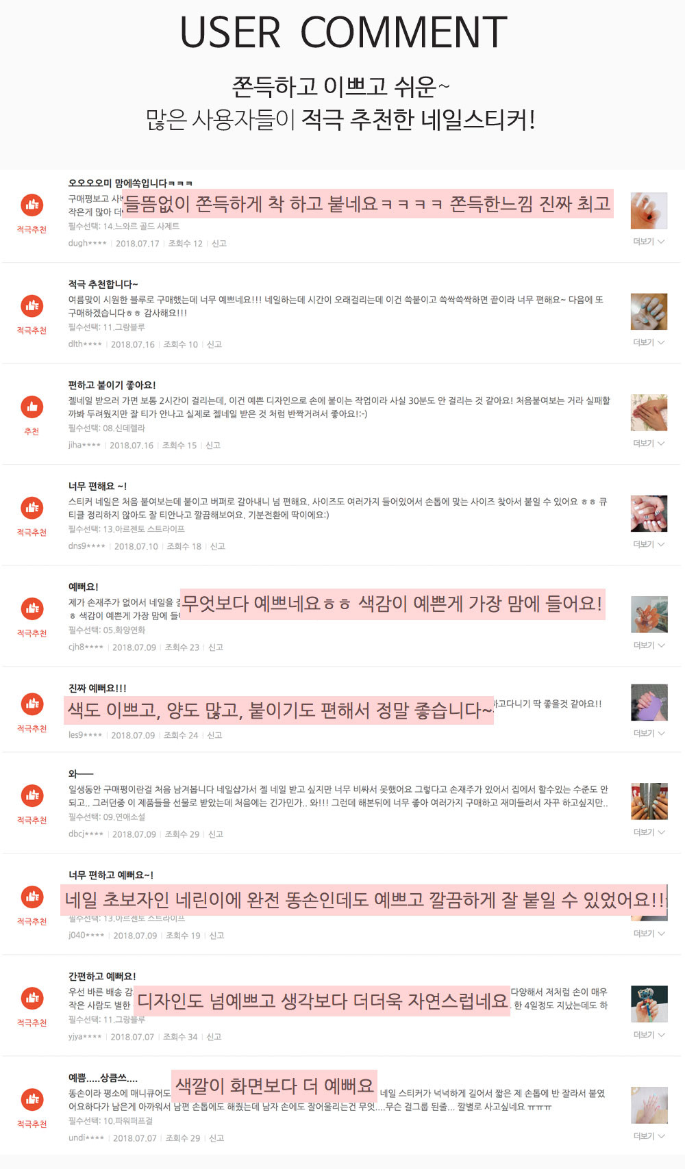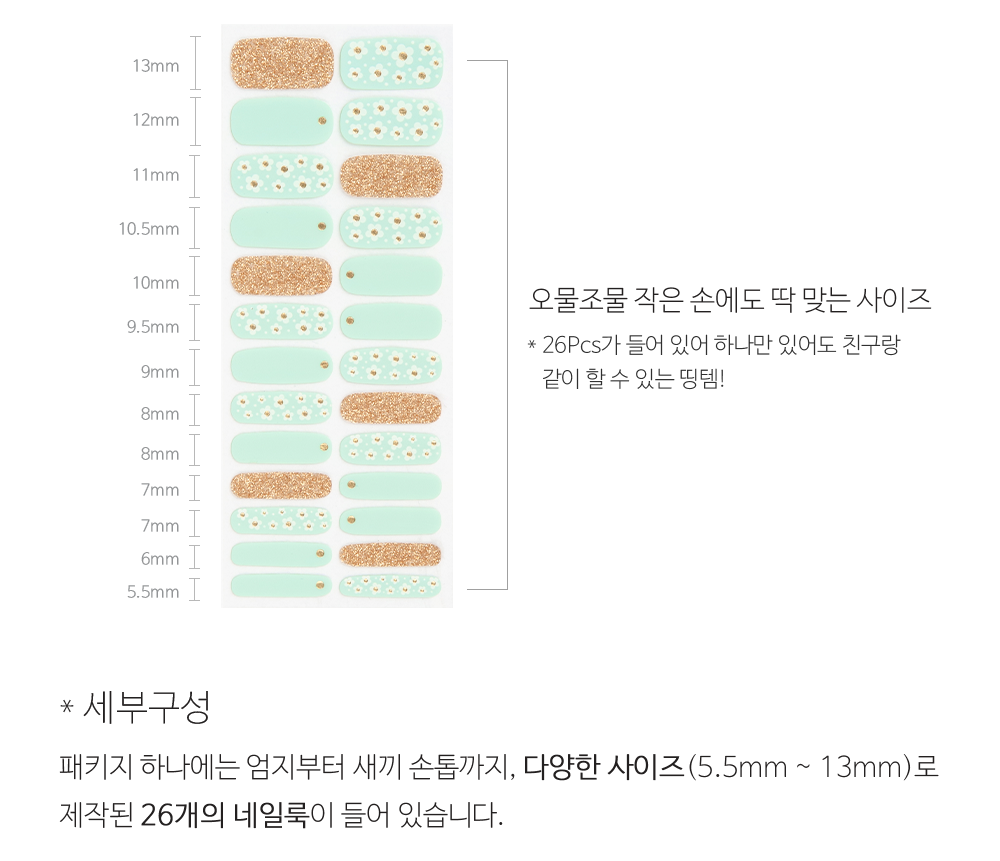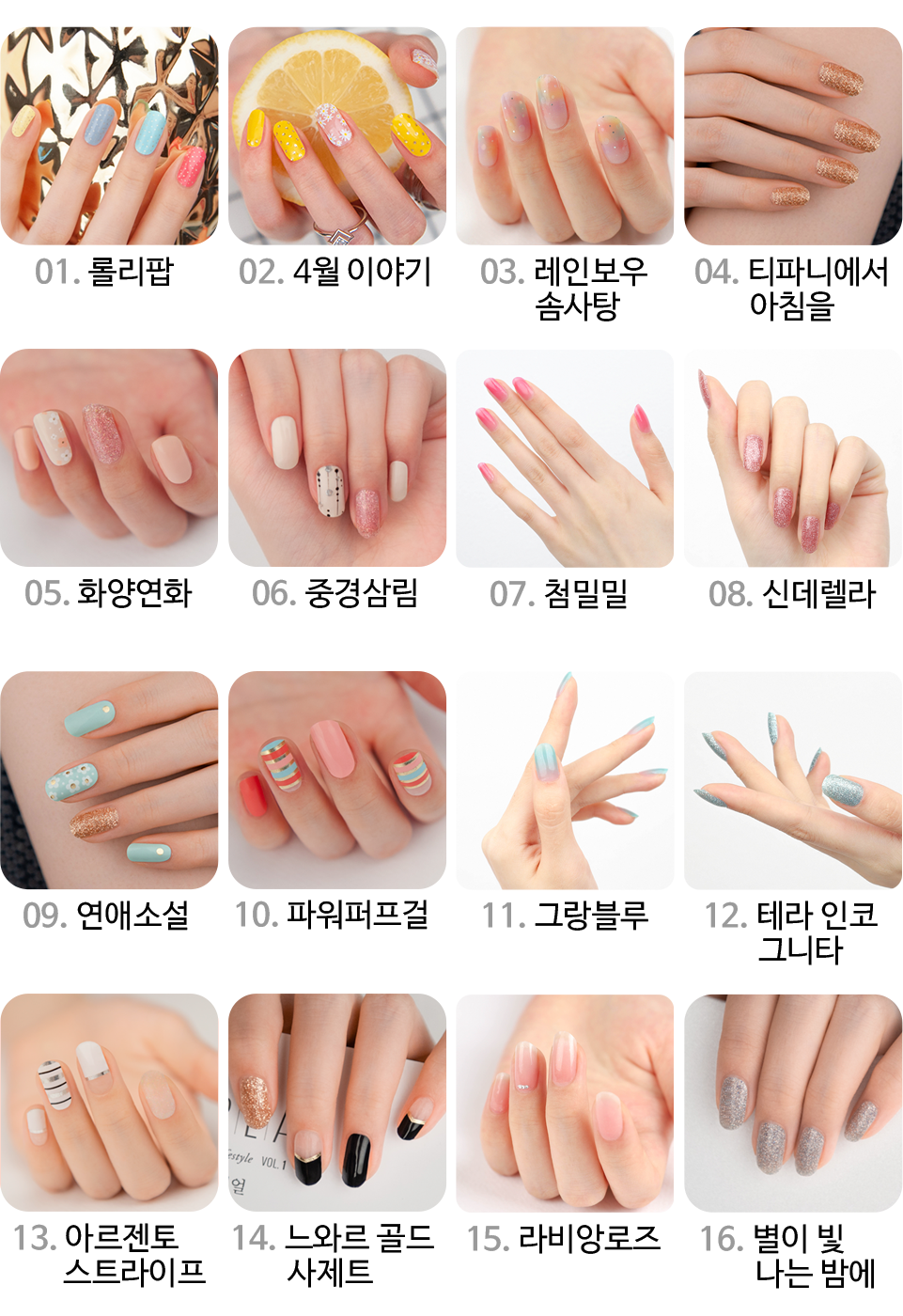 16가지 다양한 디자인의 네일룩을 낱개로 구매할 수 있습니다.